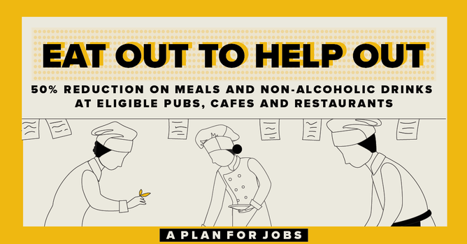 Eat Out to Help Out – The government will introduce the Eat Out to Help Out scheme to encourage people to return to eating out. This will entitle every diner to a 50% discount of up to £10 per head on their meal, at any participating restaurant, café, pub or other eligible food service establishment. The discount can be used unlimited times and will be valid Monday to Wednesday on any eat-in meal (including on non-alcoholic drinks) for the entire month of August 2020 across the UK. Participating establishments will be fully reimbursed for the 50% discount.